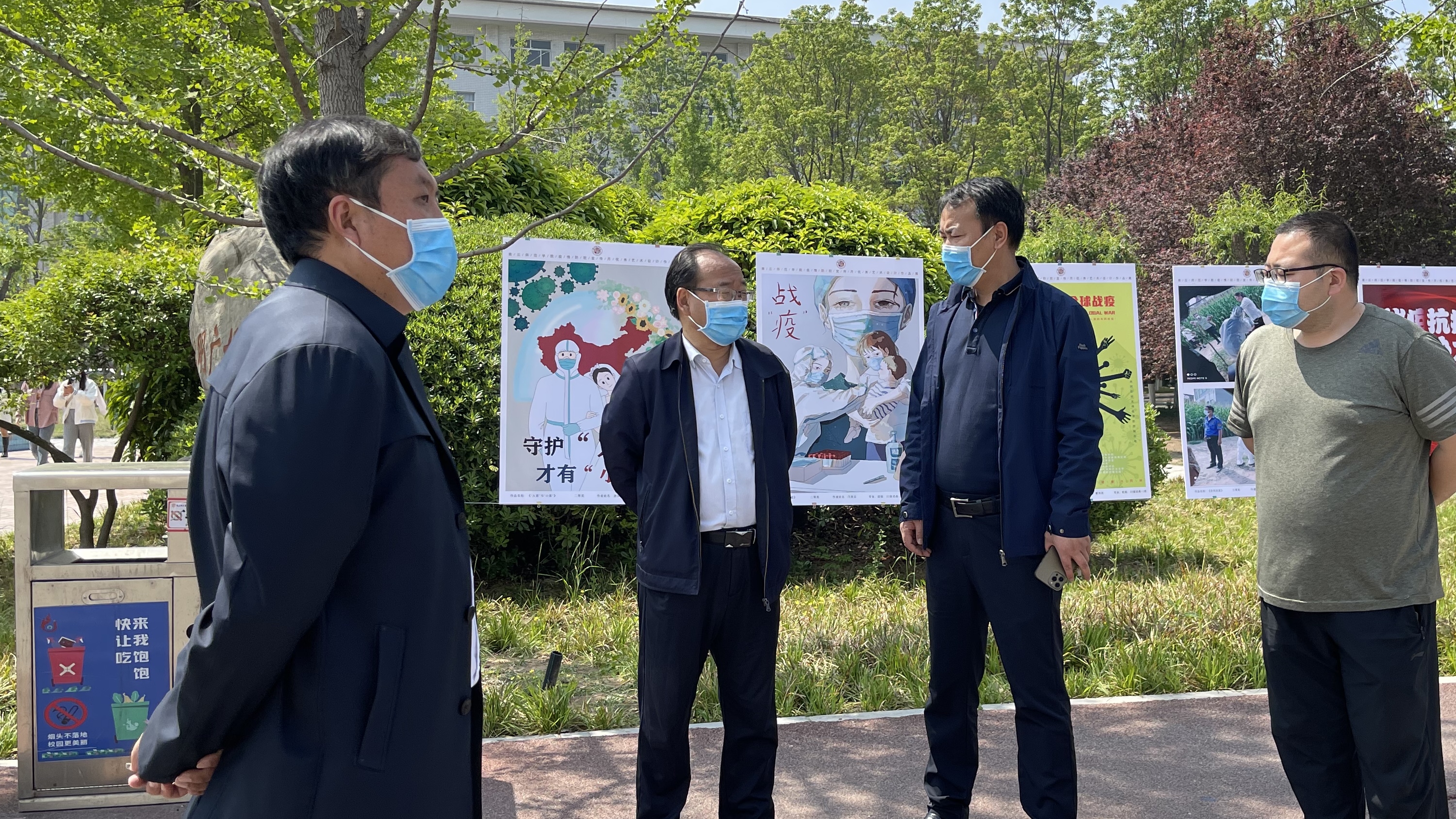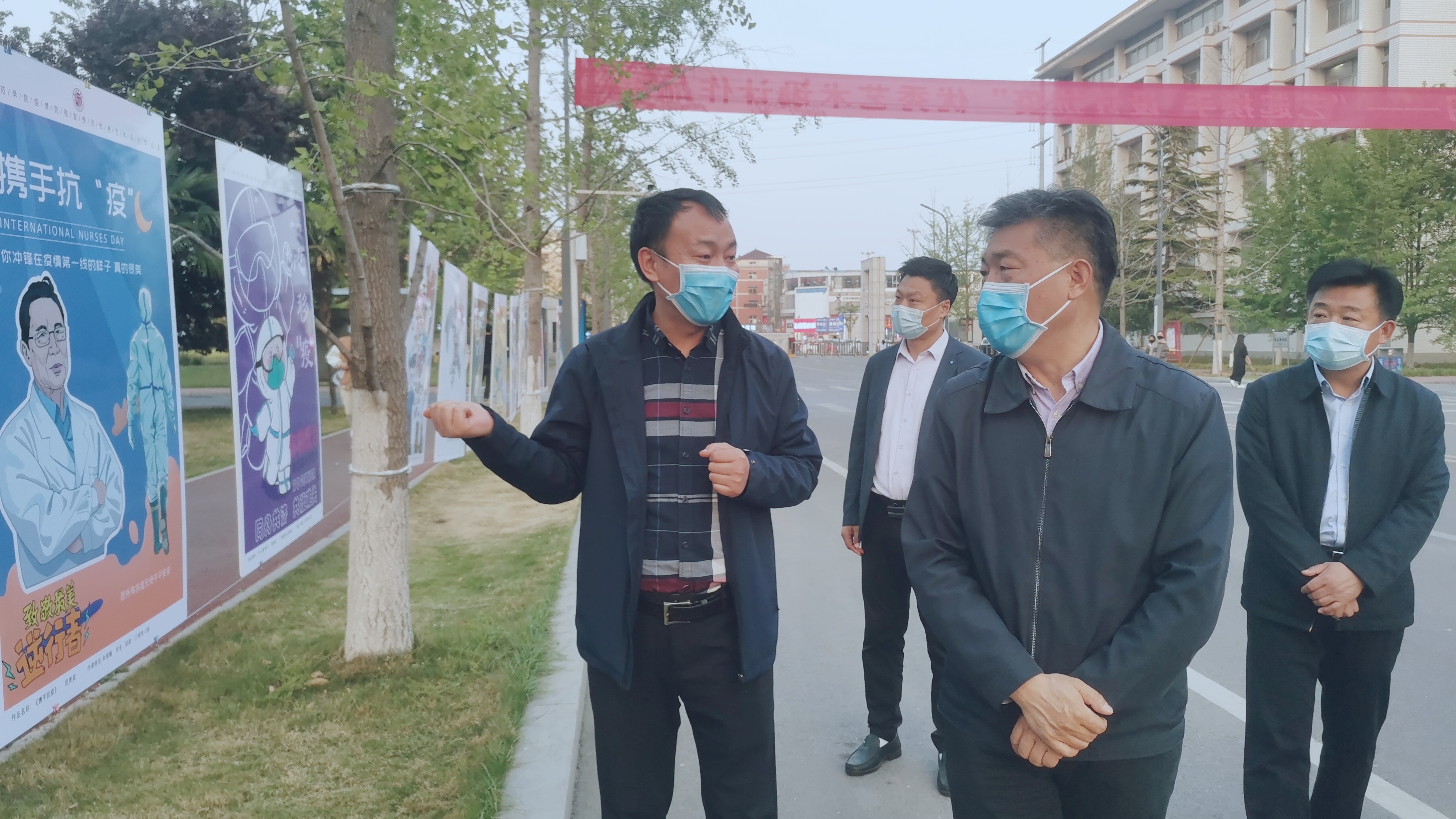 4月19日,玩滚球官网在梁园校区启明广场、大成路两侧举办疫情防控宣传月之“艺起携手 设计抗疫”优秀艺术设计作品展,学校党政领导及各防疫专班负责人参观了展览。