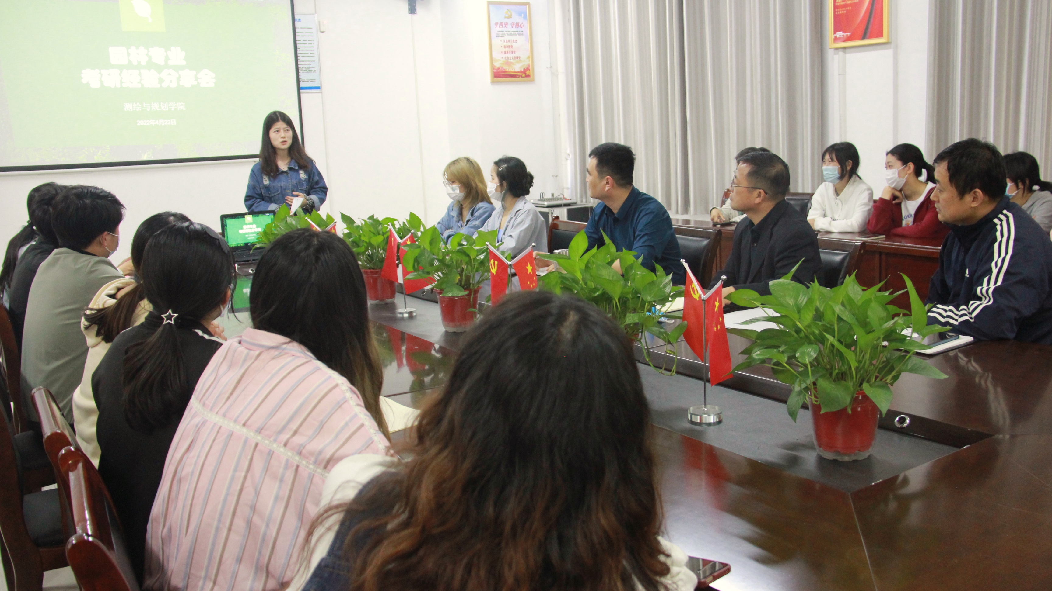 为提高同学们的考研热情,充分调动同学们考研的积极性,明确考研目标,掌握考研方法技巧,4月21日,测绘与规划学院举行考研经验分享会,副校长程功鹏,测绘与规划学院党委书记时光、院长贺振,2022届优秀考研学生代表和2019级园林专业全体学生参加会议。