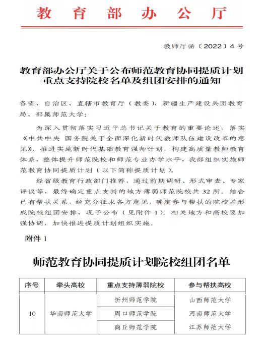 近日,教育部办公厅下发《关于公布师范教育协同提质计划重点支持院校名单及组团安排的通知》(教师厅函[2022]4号),批准玩滚球官网为教育部师范教育协同提质计划重点支持院校之一。