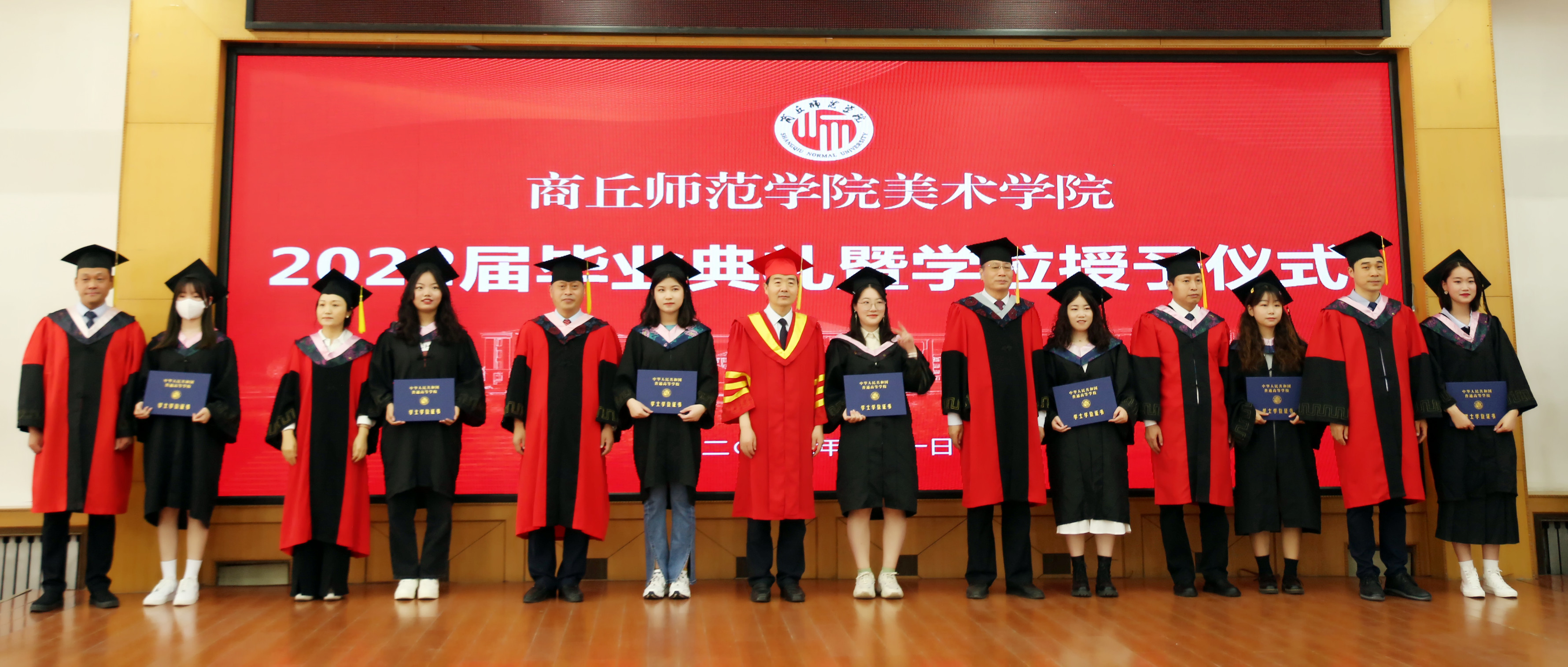 校领导与学院领导共同为同学们扶正流苏、颁发学士学位证书并合影留念。