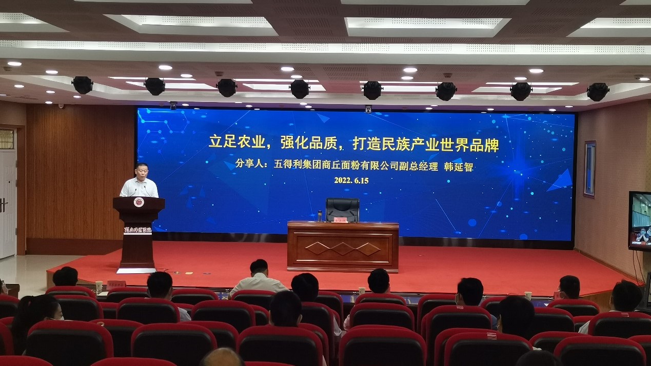 五得利集团商丘面粉有限公司副总经理韩延智以《立足农业,强化品质,打造民族产业世界品牌》为题,就公司“五方得利,创造共赢”的经营理念,品牌建设,特色产业化发展之路与企业家分享了发展经验。