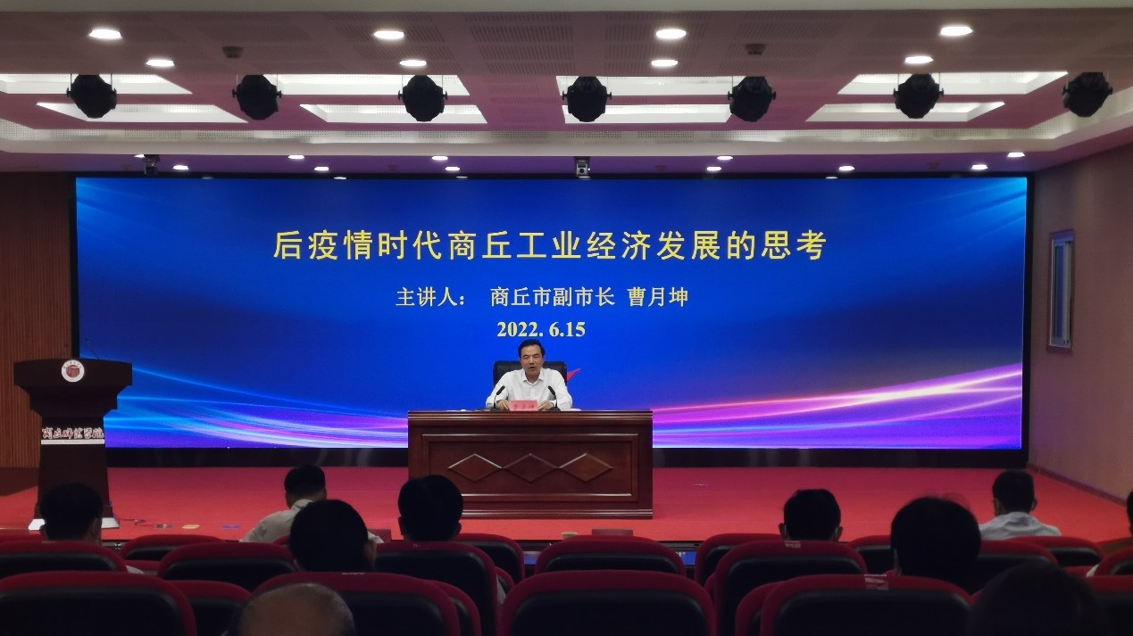 曹月坤以《后疫情时代商丘工业经济发展的思考》为题作报告。他着重从全面辩证看待当前经济形势、需要重点关注的工业经济未来发展趋势、近期国家及省市各类惠企纾困政策和措施、我市工业发展现状、我市工业发展的潜力和优势、我市工业发展的主要不足和困难以及对我市工业经济下一步发展的思考等七个方面进行了深入的阐述;指出要以新发展理念为引领,实施人才强市,布局技术研发和创新驱动,实现科技自立自强,推动产业技术高端发展。
