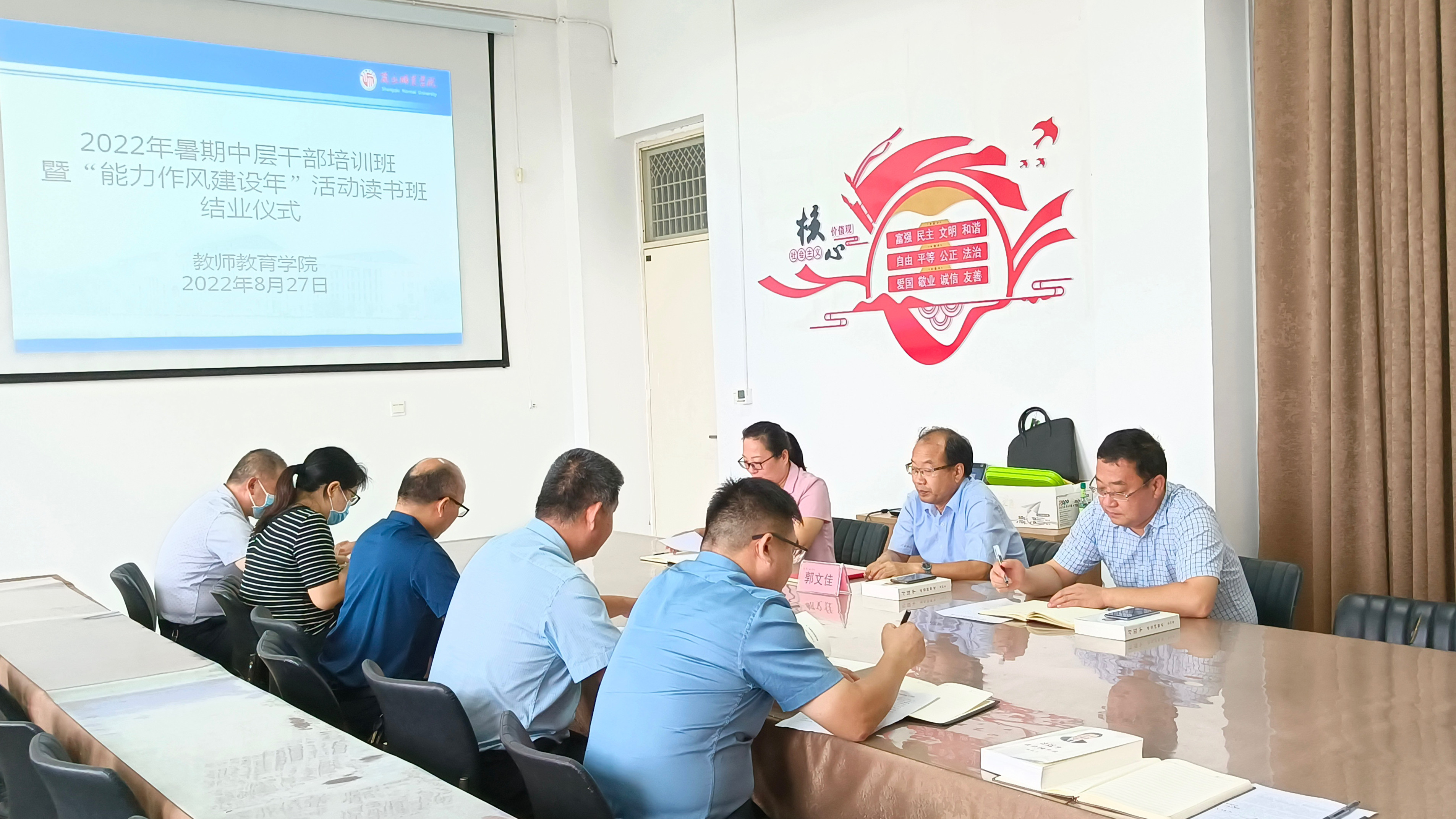 8月22日至26日,教师教育学院2022年暑期中层干部培训班暨“能力作风建设年”活动读书班圆满完成5天的学习任务,顺利结业。8月27日在汉梁楼203会议室举行了读书班结业仪式。副校长郭文佳、全体读书班学员参加,结业仪式由党委书记蒯秀丽主持。