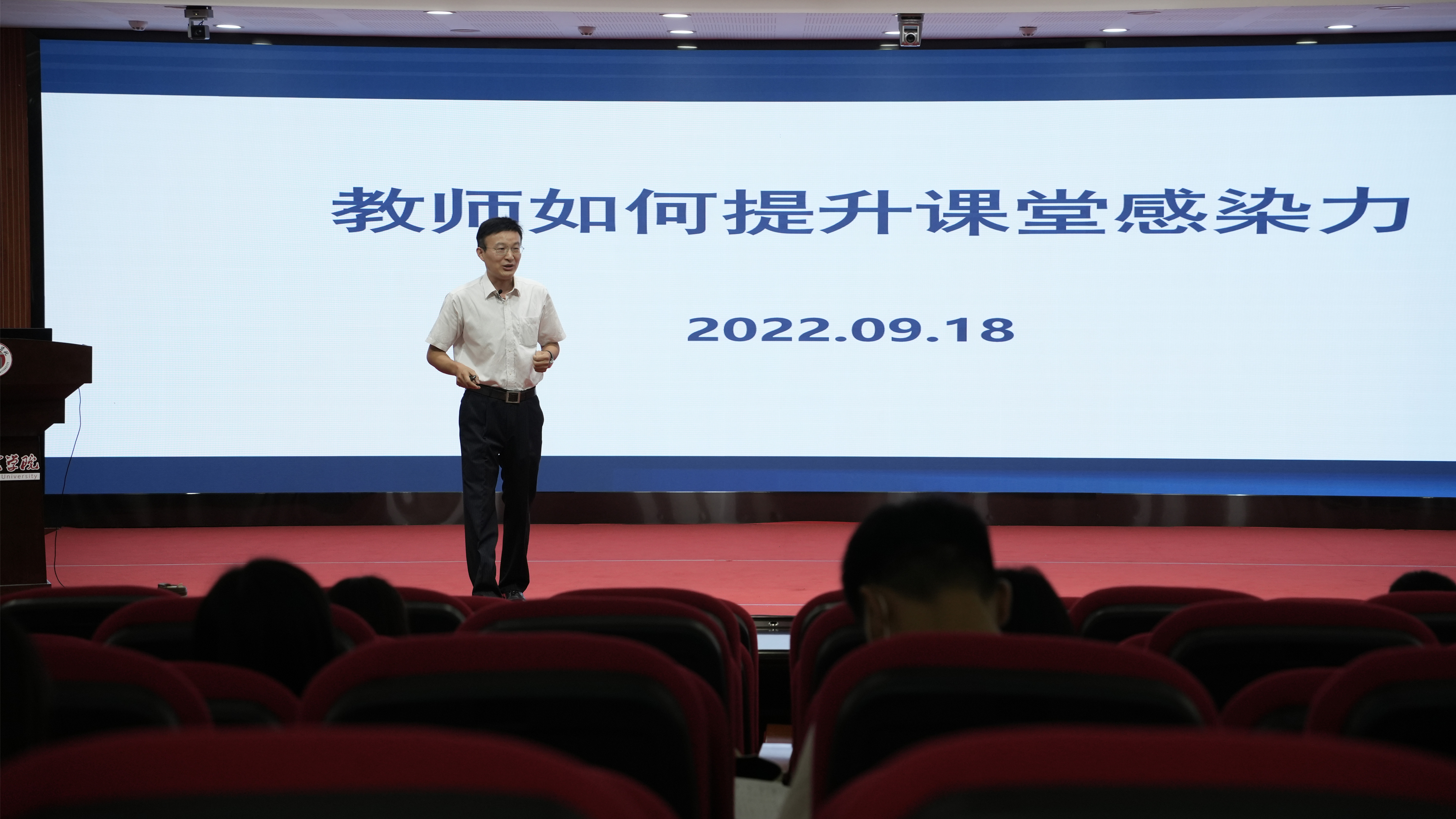数学与统计学院副教授荆天课堂教学工作坊以《教师如何提升课堂感染力》为主题,从表、实、髓、魂等四个方面详细介绍了课堂感染力的重要性与训练方法。