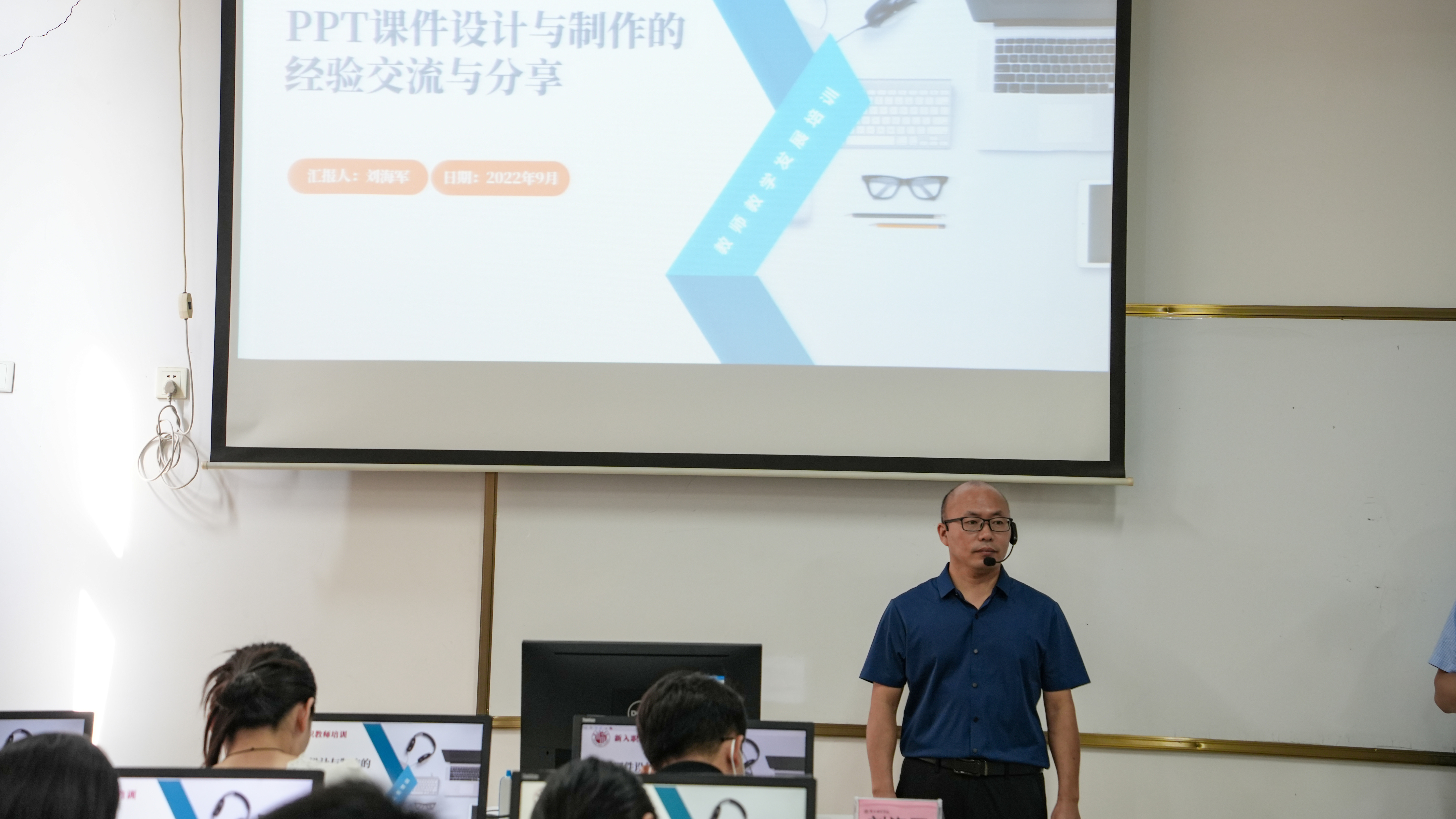 教师教育学院副院长刘海军智慧教学工作坊以《PPT课件设计与制作的经验交流与分享》为主题,以案例展示进行教学导入,介绍了教学课件的设计方法、制作技术,并现场指导教师实际操作。