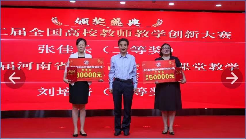 滚动评选“教学奉献奖、青年教师教学奖、校长教学质量奖”,坚持规则在先,程序规范,模式(比赛形式、评委选择、评分方式、宣传形式)创新,弘扬了评奖正能量。2019年起,河南省教育厅、中国高等教育学会举办省级、国家级教师教学大赛,玩滚球官网积极遴选组织教师参赛。在校级竞赛基础上,组织14名选手参加全省教师课堂教学创新,获得特等奖3人、一等奖2人、二等奖5人。2022年,玩滚球官网省特等奖获得者张佳乐老师参加第二届全国高校教师教学创新大赛荣获二等奖。