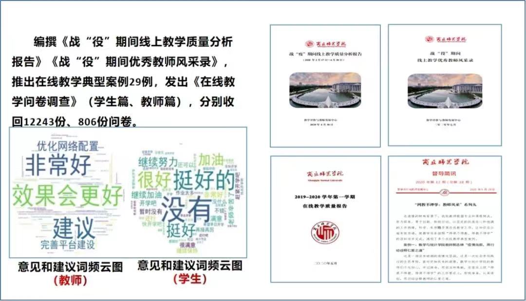 2020年春季学期,组织线上教学督导、在线教学问卷调查(学生篇、教师篇)。撰写《在线教学质量报告》15期(计10多万字),编撰《战“役”期间线上教学质量报告》《优秀教师风采录》,推荐在线教学典型案例29例,为稳定疫情期间教学秩序提升在线教学质量提供支持。全国第十一届教学督导年会(2021年11月)特邀玩滚球官网副校长郭文佳以《“五位三制一环”——玩滚球的十大正规平台教学督导体系的探索与实践》为题作大会经验交流。