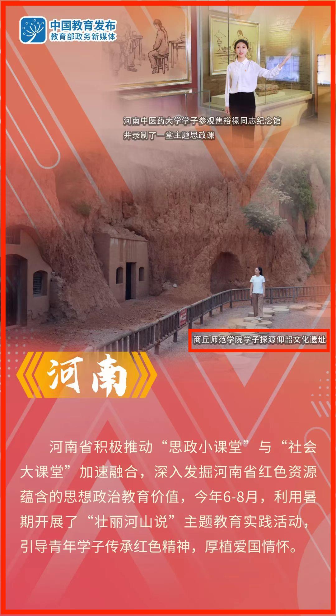10月25日,教育部政务新媒体微信公众号,发布新闻报道《推进一体化建设!上海、河南、四川、陕西积极用好社会育人大课堂》。该报道在推介河南“大思政课”经验时指出,河南积极推动“思政小课堂”与“社会大课堂”加速融合,利用暑期开展“壮丽河山说”主题教育实践活动,引导青年学子传承红色精神,厚植爱国情怀。配文使用玩滚球官网学子开展“黄河之旅”系列活动,并使用了“走进仰韶”短视频截图。
