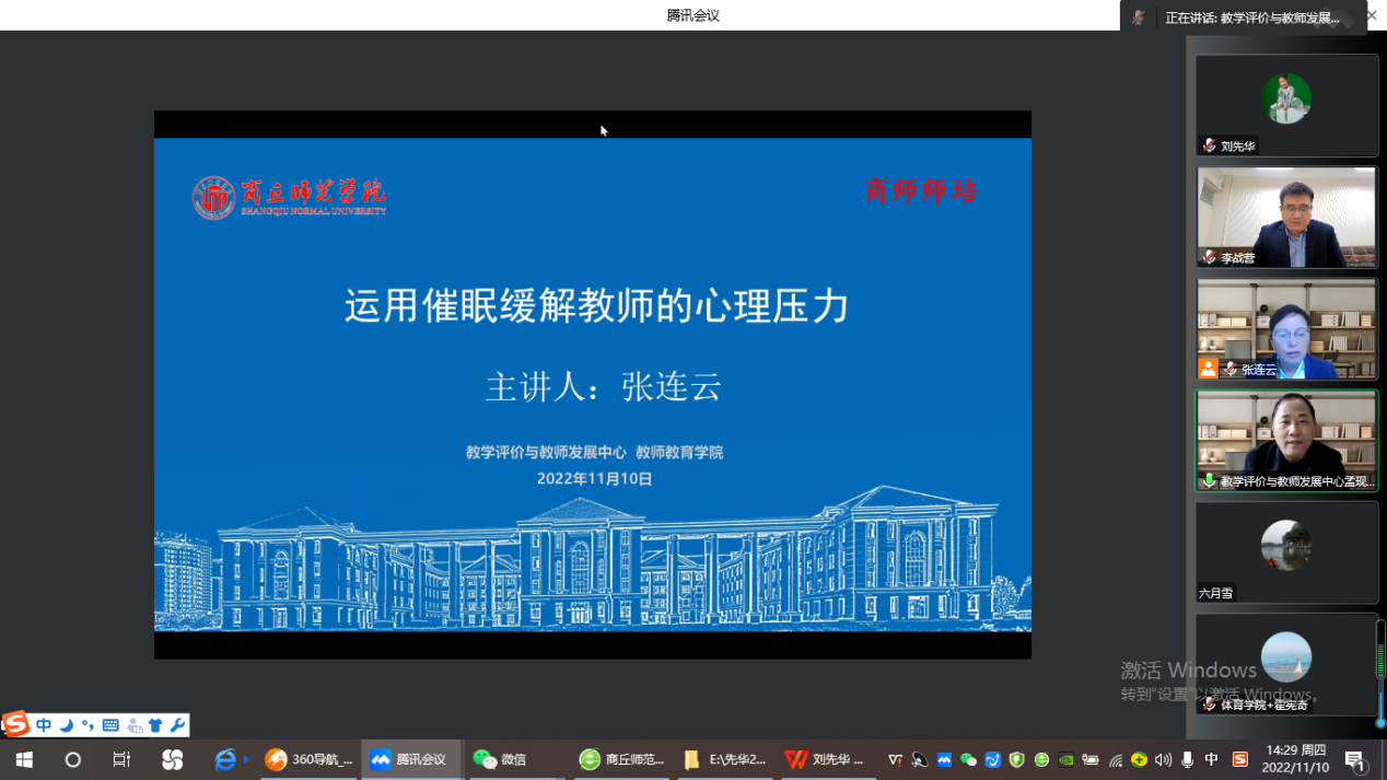 11月10日下午,由教学评价与教师发展中心主办、教师教育学院承办的“笃信论坛”通过腾讯会议进行线上直播。教师教育学院张连云教授作了题为《运用催眠缓解教师的心理压力》讲座,150多位来自校内外的教师参加了此次活动。讲座由教师教育学院副院长李战营主持。