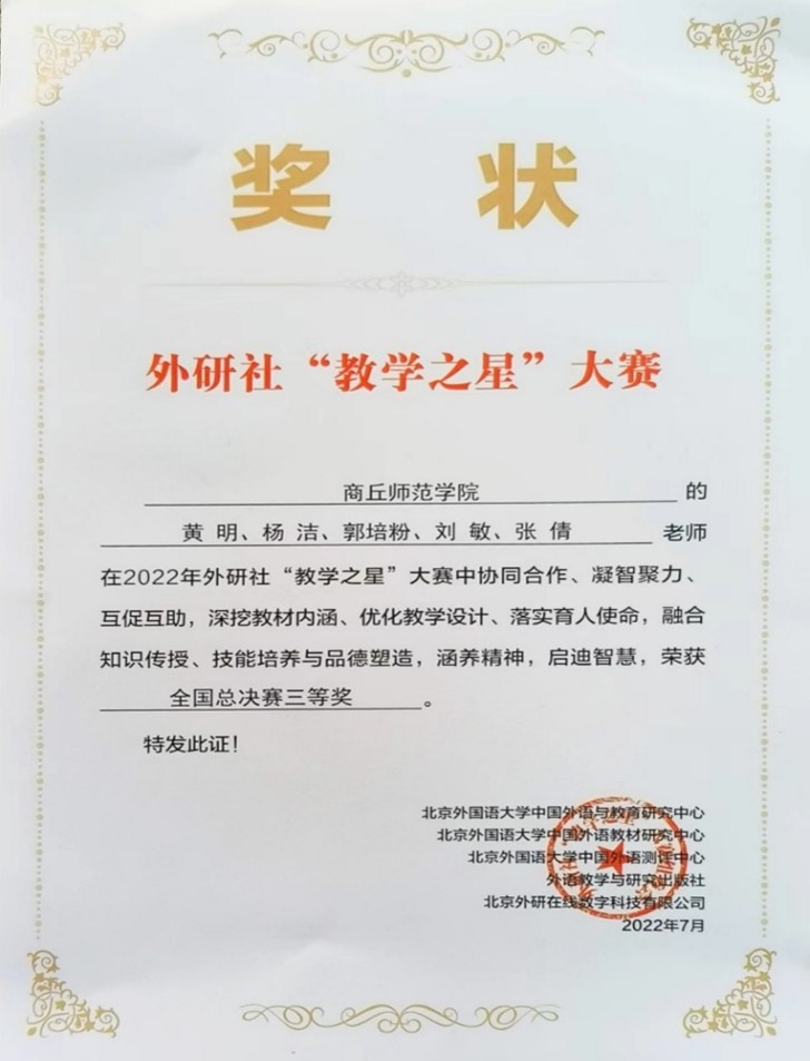 2022年7月外研社“教学之星”大赛在云端落下帷幕,外语学院黄明教师团队经过层层选拔,最终取得了全国半决赛二等奖、全国总决赛三等奖的好成绩,该成绩为本项国家级教学竞赛自玩滚球的十大正规平台外语学院参赛以来的最好成绩。