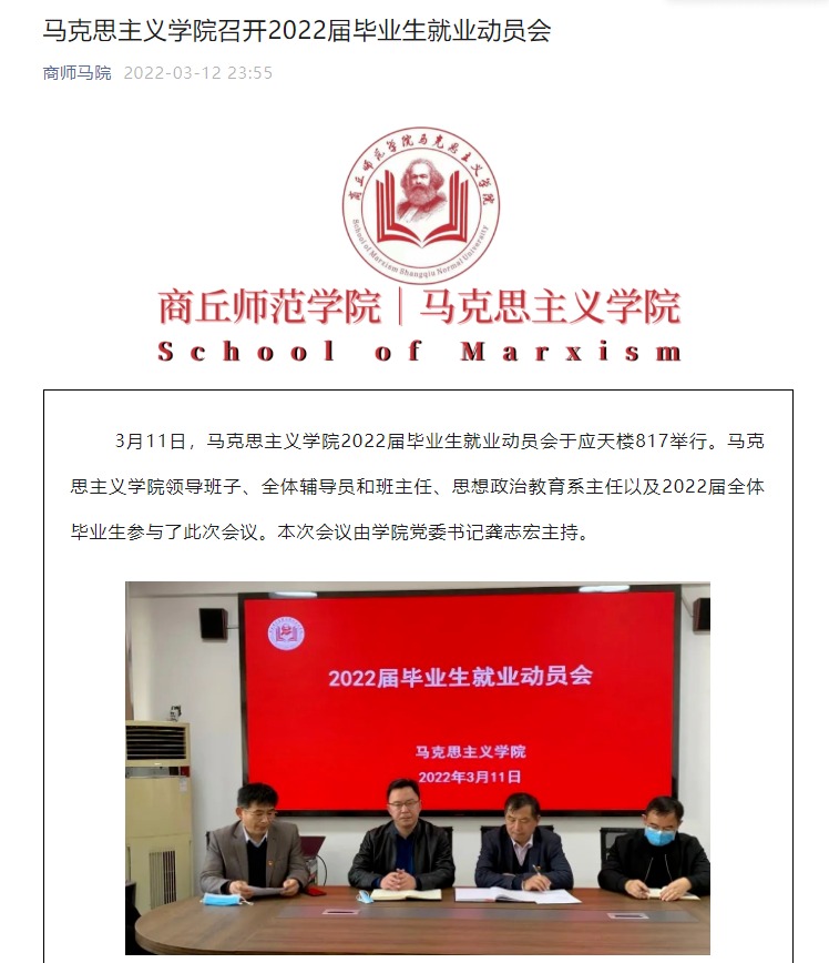 马克思主义学院在校党委领导下,高度重视毕业生就业工作,始终以服务经济社会发展为核心,以实现充分高质量就业为目标,落实就业“一把手”工程,扎实推进毕业生就业工作,就业结构持续优化,就业质量稳步提升,2022届毕业生总体就业率96%,毕业生就业质量调查问卷完成率93%,均排名全校第一,44%考研成功继续深造,41%成功应聘公务员、教师等专业契合度高的岗位,实现了高质量就业,并被商丘电视台作为推动毕业生就业典型进行了宣传报道,广受社会赞誉。