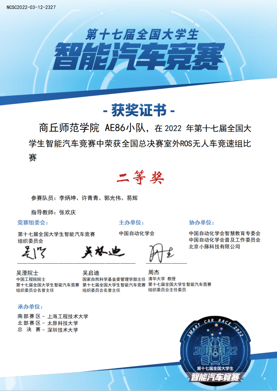 2022年全国大学生智能汽车竞赛室外专项赛总决赛由中国自动化学会主办,中国自动化学会智慧教育专业委员会、深圳技术大学承办,分为室外ROS无人车竞速赛、室外远程驾驶无人车赛、室外智能驾驶挑战赛、室外无人驾驶自行车挑战赛、无人车调试与维修赛等5个赛项,吸引了来自哈尔滨工业大学、武汉大学、同济大学、山东大学、国防科技大学等全国170多所高校近2800名选手参赛。经过分赛区比赛选拔后,最终共产生226支队伍晋级全国总决赛,玩滚球官网AE86小队在河南赛区表现优异,成功入围全国总决赛。最终,经过总决赛激烈角逐,AE86小队脱颖而出,荣获室外ROS无人车竞速组全国二等奖。