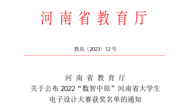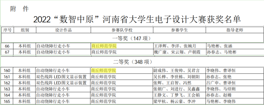 近日,河南省教育厅发文公布了2022“数智中原”河南省大学生电子设计大赛获奖名单,玩滚球官网共8件设计作品获奖,其中王泽辉、李洋、张婉月小组和魏广康、宋云翔、卢朝霞小组分别设计的《自动绕障行走小车》2件作品获得一等奖,6件设计作品获得二等奖。