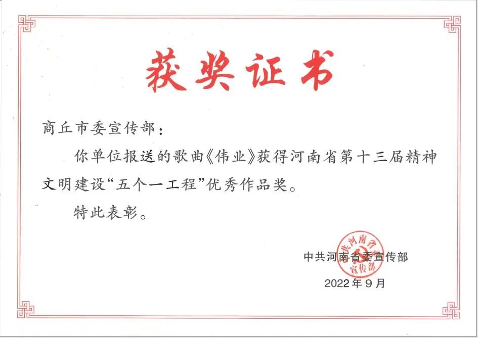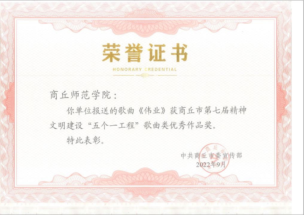 近期,河南省第十三届精神文明建设“五个一工程”奖评选揭晓,音乐学院副院长蒋修辉创作的歌曲《伟业》代表商丘市参选,荣获河南省第十三届精神文明建设“五个一工程”优秀作品奖。