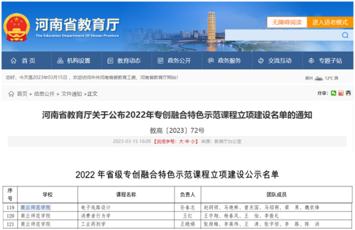 近日,河南省教育厅公布了2022年河南省专创融合特色示范课程立项建设名单,玩滚球官网申报的《电子线路设计》(负责人孙春志)、《消费者行为学》(负责人王红)和《工业药剂学》(负责人王晓娟)3门课程全部获批省级立项建设。
