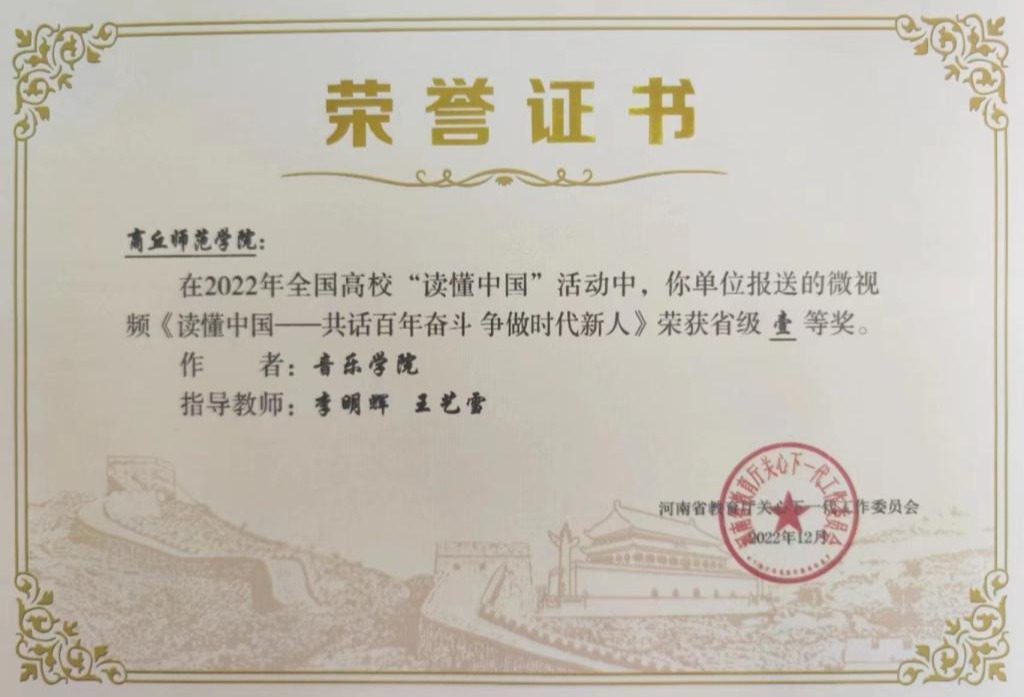 近日,河南省教育厅关心下一代工作委员会2022年全国高校“读懂中国”活动评选结果揭晓,我院报送的微视频《读懂中国——共话百年奋斗 争做时代新人》,从全省数百个微视频作品中脱颖而出,荣获省级一等奖。