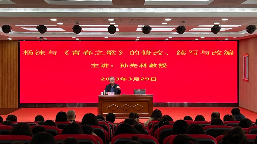 3月29日上午,应传媒学院邀请,河南大学博士生导师、郑州师范学院校长孙先科教授在三商楼145会议室作了题为“杨沫与《青春之歌》的修改、续写与改编”的学术报告。传媒学院领导班子成员、传媒学院及人文学院师生200余人现场听取报告。本次讲座由副校长辛作义主持。
