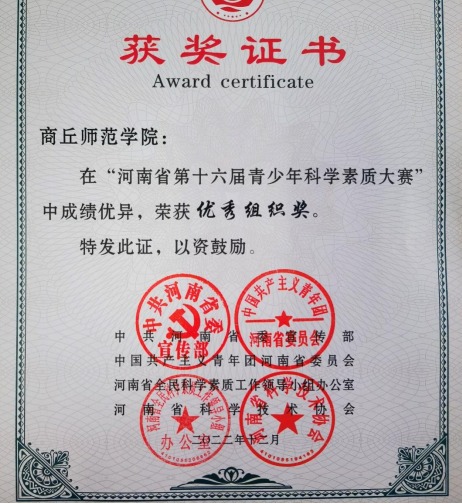 近日,省委宣传部、团省委、省素质办、省科协公布“河南省第十六届青少年科学素质大赛”获奖名单,玩滚球的十大正规平台荣获“优秀组织奖”。