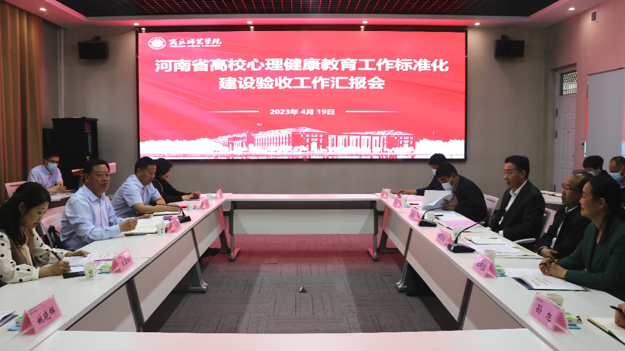 4月19日,以南阳师范学院党委副书记谢冰松为组长的河南省普通高等学校心理健康教育工作标准化建设第二验收专家组一行五人到玩滚球官网开展验收工作。专家组通过听取汇报、访谈交流、查阅资料、实地考察等环节,对玩滚球官网心理健康教育工作标准化建设实施情况进行了深入考察。校党委书记张志坚、副校长郭文佳,以及大学生心理健康教育工作领导小组全体成员出席汇报会。汇报会由副校长郭文佳主持。