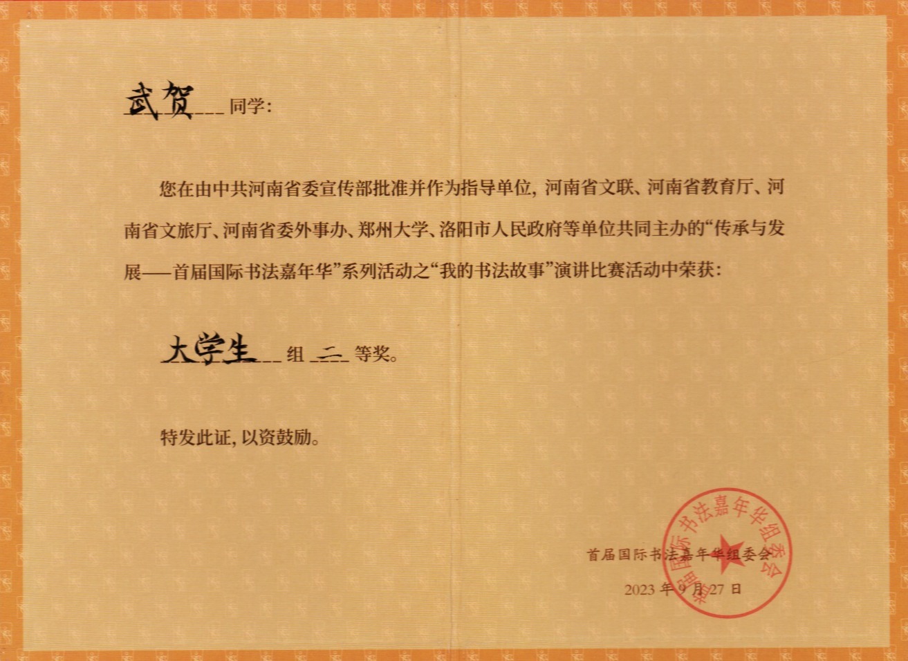 由河南省文联、河南省教育厅、河南省文旅厅、河南省委外办、郑州大学、洛阳市人民政府联合主办的“传承与发展——首届国际书法嘉年华”系列活动之一“我的书法故事”演讲比赛于2023年9月27日在河南省洛阳市张海书法艺术馆举行。