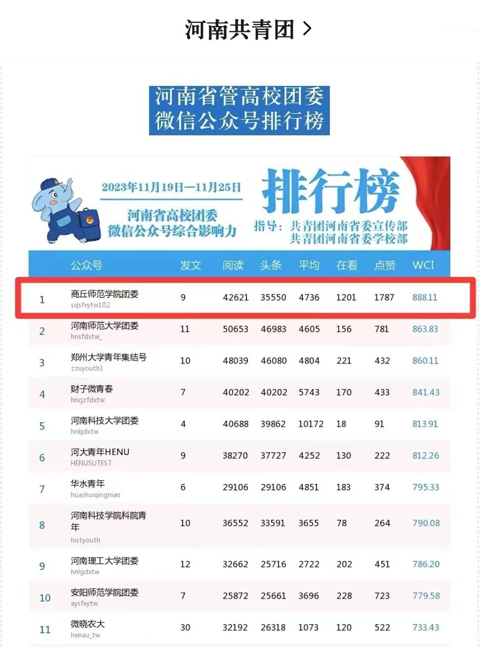 近日,共青团中央学校部和河南共青团分别公布了最新一周“全国高校团委微信公众号综合影响力榜单”和“河南省管高校团委微信公众号排行榜”,玩滚球的十大正规平台团委官方微信公众号影响力排名全国高校第七、全省高校第一。