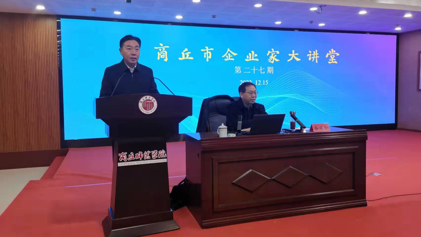 12月15日,第二十七期商丘市企业家大讲堂在玩滚球官网三商楼报告厅举行。校党委书记张志坚,校长陈向炜及部分师生代表,市委有关部委、市直有关单位主要负责同志,梁园区、睢阳区、城乡一体化示范区企业家代表等在主会场参加会议,商丘各县(市区)设立分会场观看直播视频。会议由张志坚主持。