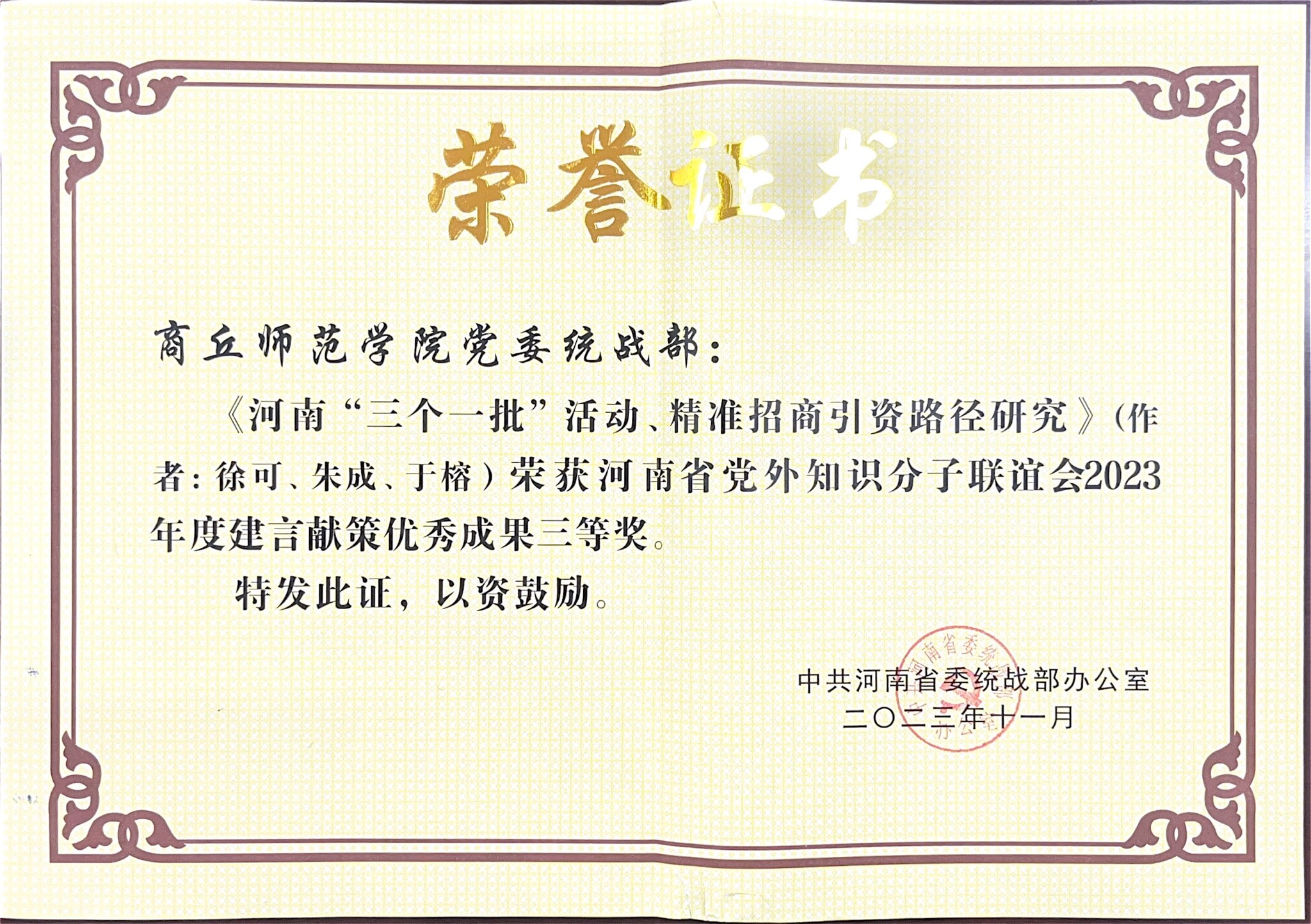 根据省委统战部《关于确定河南省党外知识分子联谊会2023年度调研课题的通知》要求,省知联会组织各地各高校知联会充分发挥智力密集优势,锚定“两个确保”,聚焦“十大战略”,深入开展调查研究,形成了79篇高质量的调研报告,其中玩滚球官网苏世昌等人完成的《“产教融合、农旅协同”驱动河南乡村振兴的对策设计研究》荣获二等奖;徐可等人完成的《河南“三个一批”活动、精准招商引资路径研究》荣获三等奖。