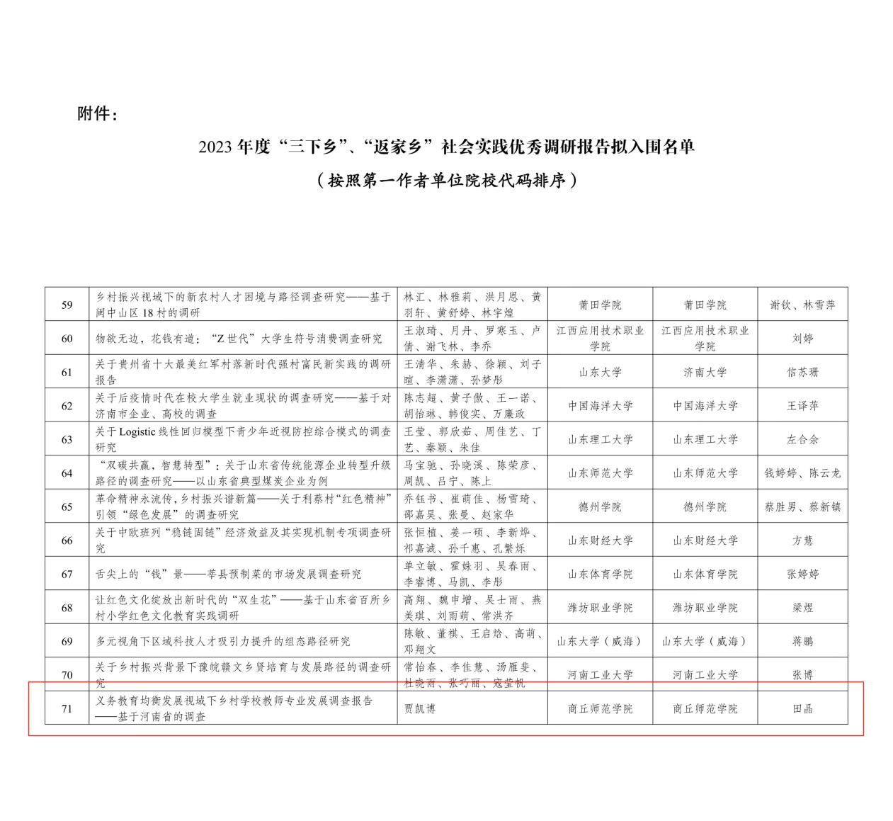 2023年度“三下乡”、“返家乡”社会实践调研报告遴选工作相关安排,经资格审查、专家评审等环节,玩滚球官网教师教育学院《义务教育均衡发展视域下乡村学校教师专业发展调查报告——基于河南省的调查》入围2023年度“三下乡”、“返家乡”社会实践优秀调研报告。