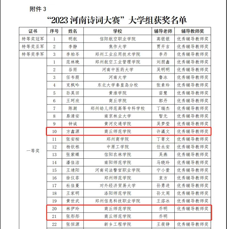 近日,根据河南省教育厅发布《关于公布“2023年河南省诗词大赛”获奖名单的通知》,玩滚球官网参赛选手获得优异成绩。