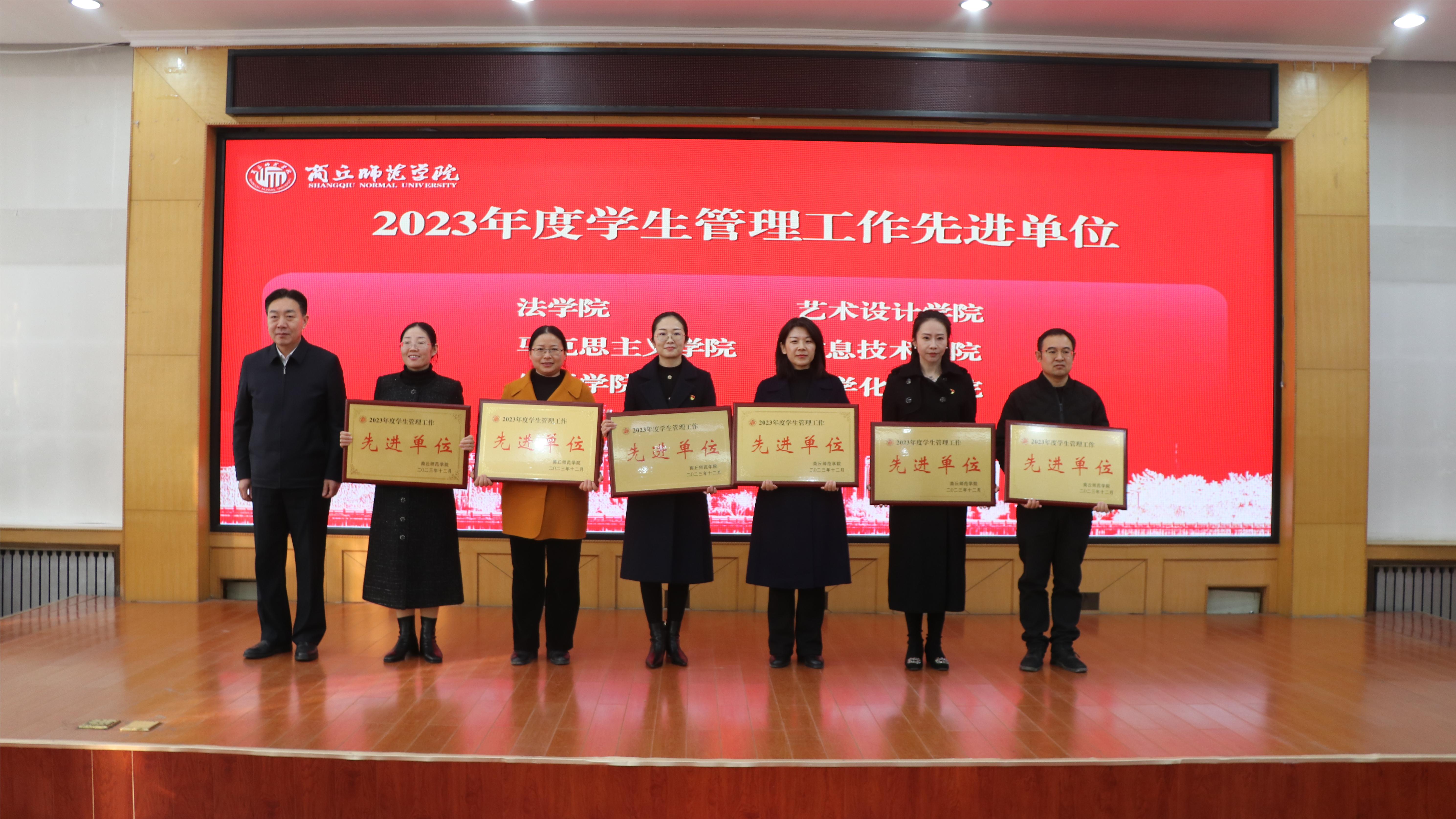大会在庄严的国歌声中拉开序幕,表彰大会回顾了玩滚球官网2023年度学生管理工作,王晓征和学生处负责同志分别宣读获奖单位及获奖个人表彰决定。校领导为获得2023年度“学生管理工作先进单位”等十余项荣誉的集体和个人颁奖并合影留念。获奖学院代表外语学院党委副书记王頔、获奖个人代表马克思主义学院辅导员戚瑞静作交流发言。