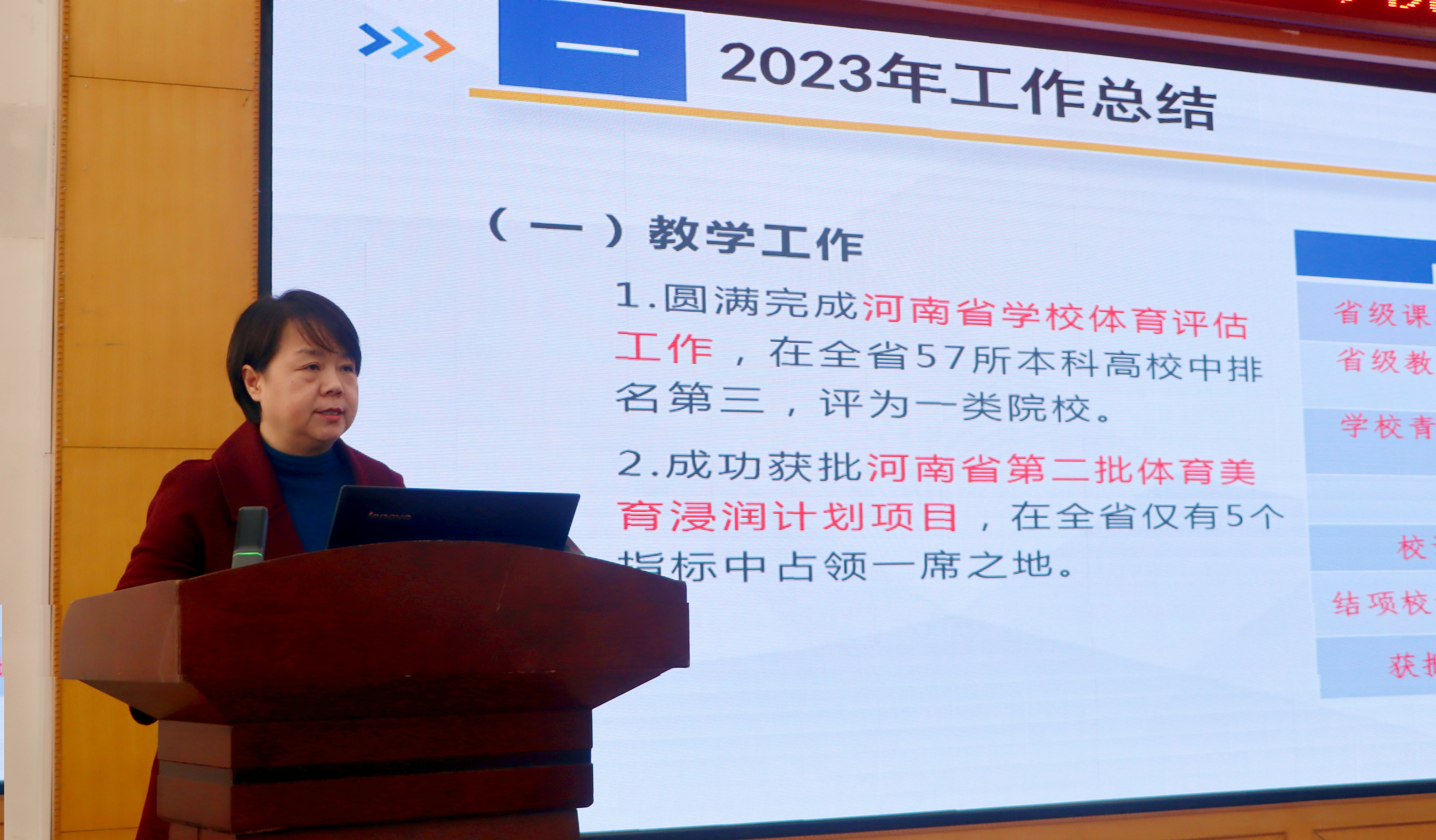 2023年,体育学院在校党委和行政的正确领导下,在全体教职工的努力下,教学、科研、学生管理等方面都圆满完成了目标任务,特别是在全国和河南省的各项体育竞赛中表现突出,共获得金牌38枚银牌28枚铜牌33枚,创历史新高,同时成功举办了玩滚球官网大学生运动会和篮球、排球等11项群体活动,取得了良好的效果。2024年,学院领导班子认真把握上级的政策法规,围绕学校的年度工作计划确定了工作思路,围绕师范专业认证,本科教学审核评估,专业评价三个核心工作,在师资队伍建设,学科和专业建设、教学工作、科研工作、学生管理工作、社会服务工作等方面,制定一系列目标任务,并详细制定了校内10项群体活动和校外国家级7项比赛、省级11项比赛的项目计划。目标明确,措施具体,重点突出。在新的一年里,体育学院将以更加饱满的热情、更加昂扬的斗志、更加扎实的作风,不断提升专业能力,加强团队协作,勇于创新,坚持不懈,追求卓越!