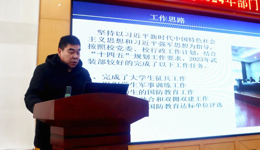 一、工作思路。坚持以习近平新时代中国特色社会主义思想和习近平强军思想为指导,按照校党委、校行政工作计划,结合“十四五”规划工作要求,2023年武装部较好地完成了以下工作任务。1、完成了大学生征兵工作。2、组织学生军事训练工作。3、做好师生的国防教育工作。4、做好军民融合和双拥双建工作。5、完成了高校国防教育达标单位评选工作。二、工作计划。1、进一步完善武装部工作制度。2、做好2024年玩滚球官网大学生征兵工作。3、做好2024年新生军事训练工作。4、做好国防教育及民兵连建设工作。5、做好军民融合和双拥共建工作。三、重点工作。争创河南省国防教育模范高校示范单位。推进民兵连示范校建设,加强大学生民兵队伍常规训练,进一步提高民兵水平技能,组织民兵开展国内外战备形势和任务,结合军事训练相关内容,增强民兵国防观念和战备意识。力求早日创建河南省国防教育模范高校示范单位。